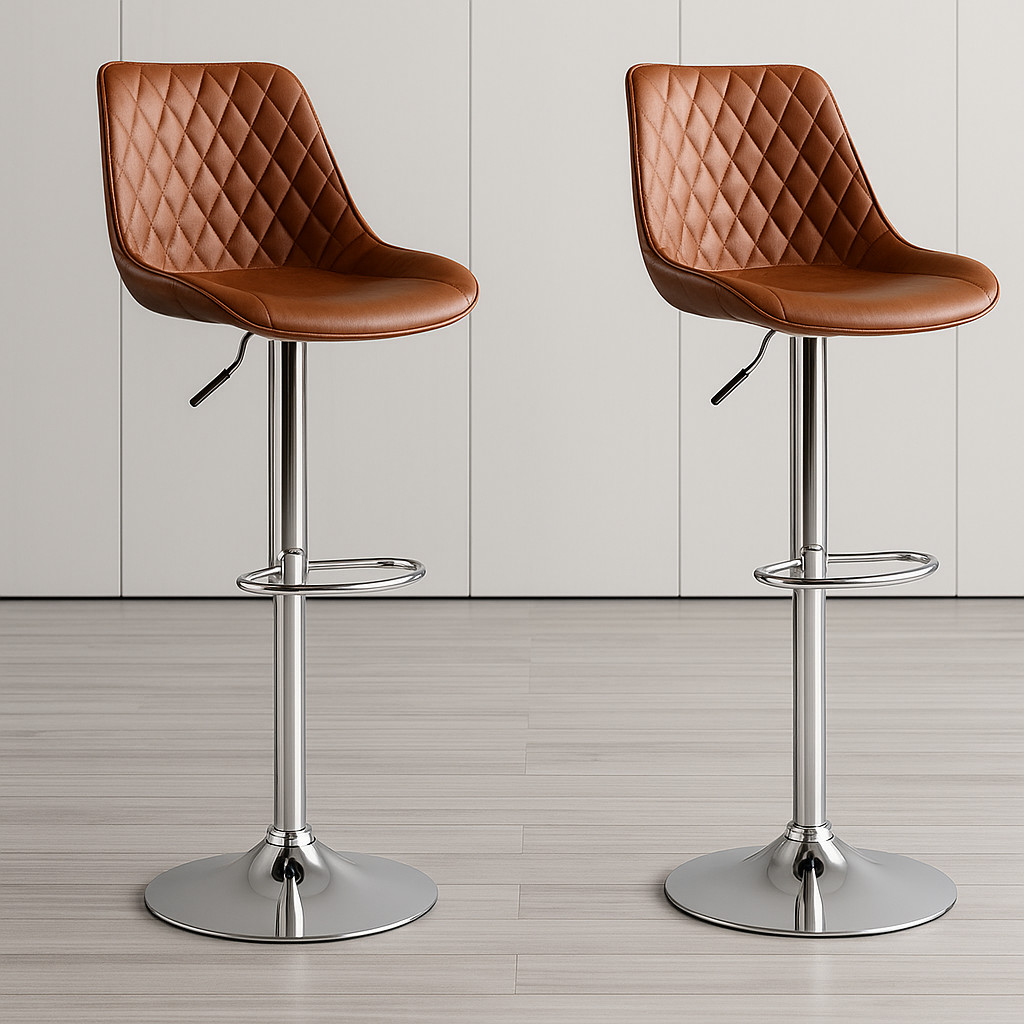 A varrásminta modern és stílusos dizájnt biztosít. Az ülőpárna 360 fokban elforgatható, a magassága fogantyúval állítható. Az üléspárna alatti fogantyú szintén 360 fokkal elforgatható, így a magasságot különböző irányokba állíthatja. A nagy sűrűségű, vastag szivacspárna kényelmes ülést biztosít. A párna felülete PU bőrből készült a könnyű tisztítás érdekében. A lábtartó kialakítás megkönnyíti a lábak elhelyezését, nyugodtan hátra dőlhet és lazíthat. Az alap króm acélból készül, ami tartóssá teszi. A gumigyűrű alja megakadályozza a padló karcolódását.