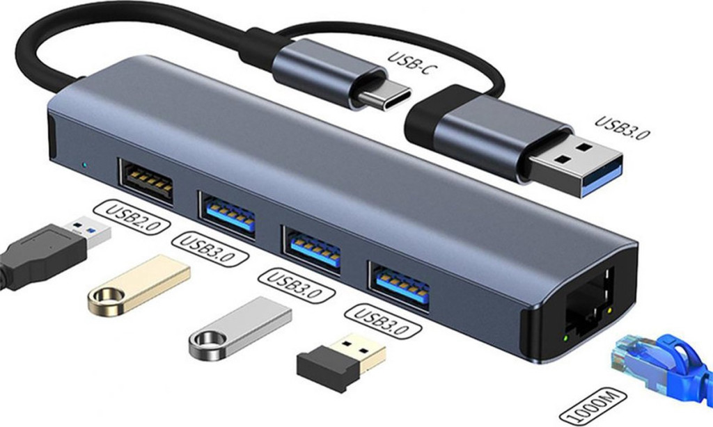 5 portos USB HUB - 3xUSB 3.0 1xUSB 2.0 1xEthernet RJ45