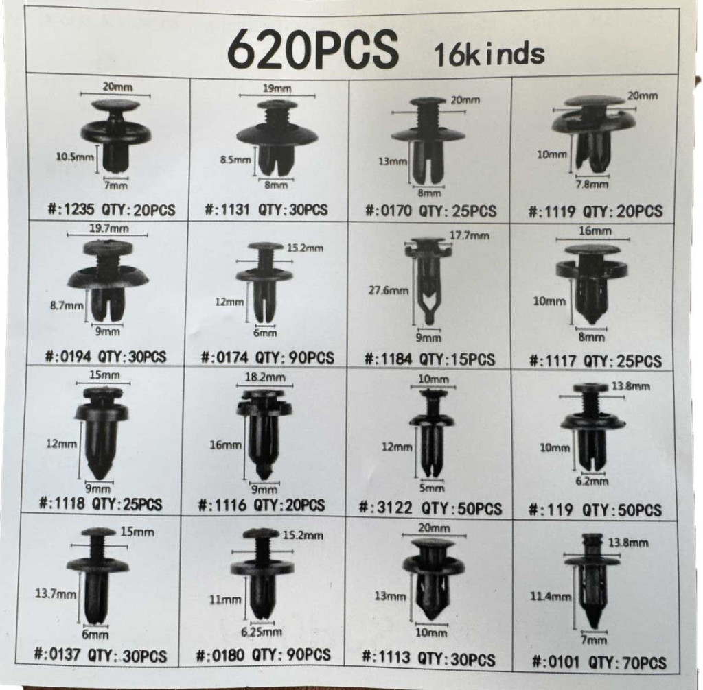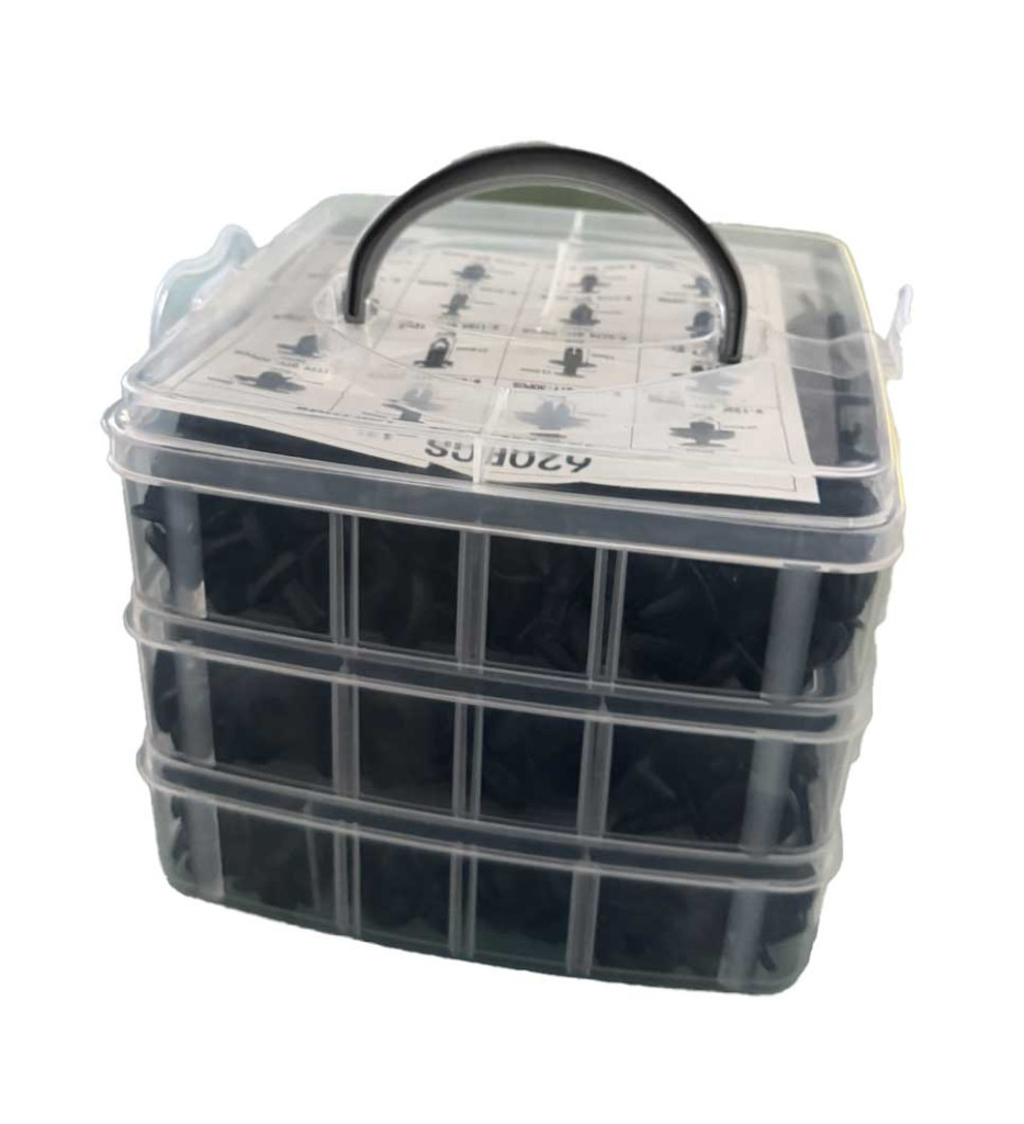 620 db-os autókapcsos készlet, műanyag, univerzális, 16 különböző modell, fekete