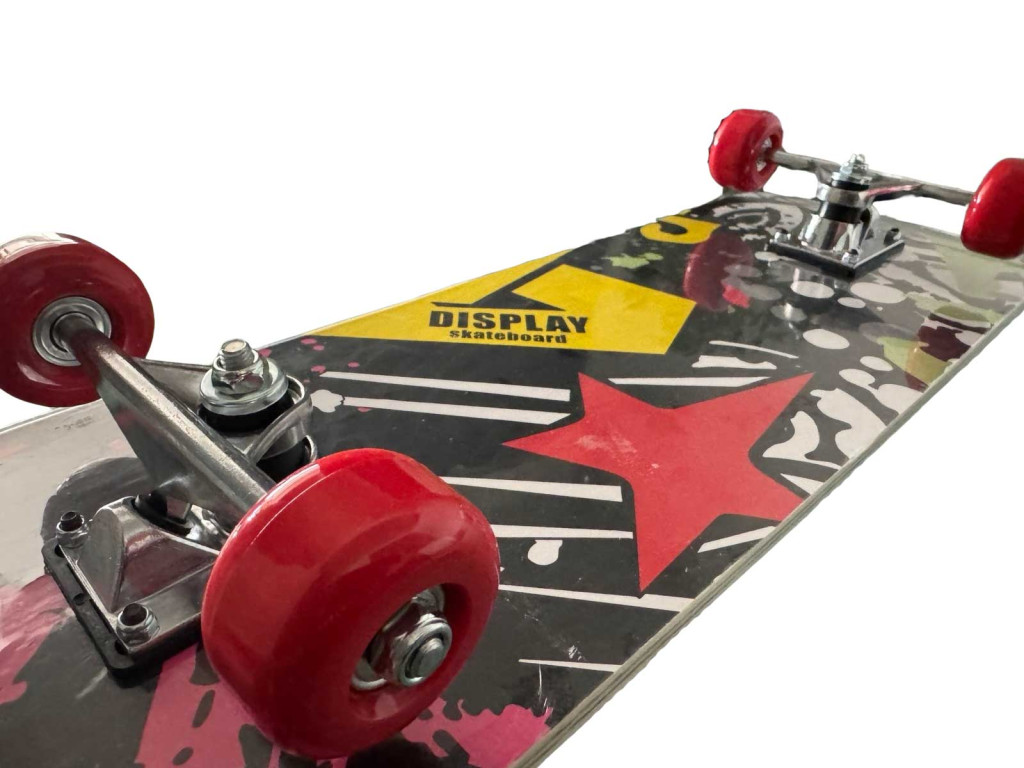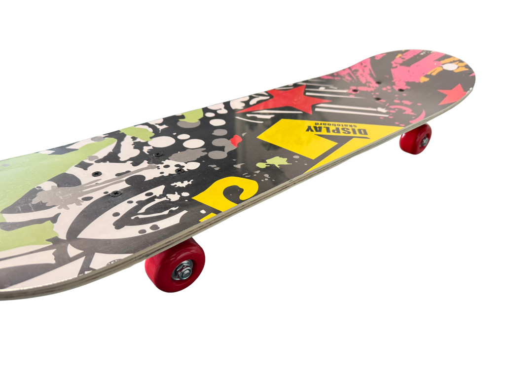 A masszív kialakítás strapabíró használatot tesz lehetővé, míg a minőségi kerekek és felfüggesztés gördülékeny haladást biztosítanak különböző burkolatokon. A dinamikus, figyelemfelkeltő grafika modern és vagány megjelenést kölcsönöz a deszkának, így nemcsak sporteszköz, hanem stílusos kiegészítő is.