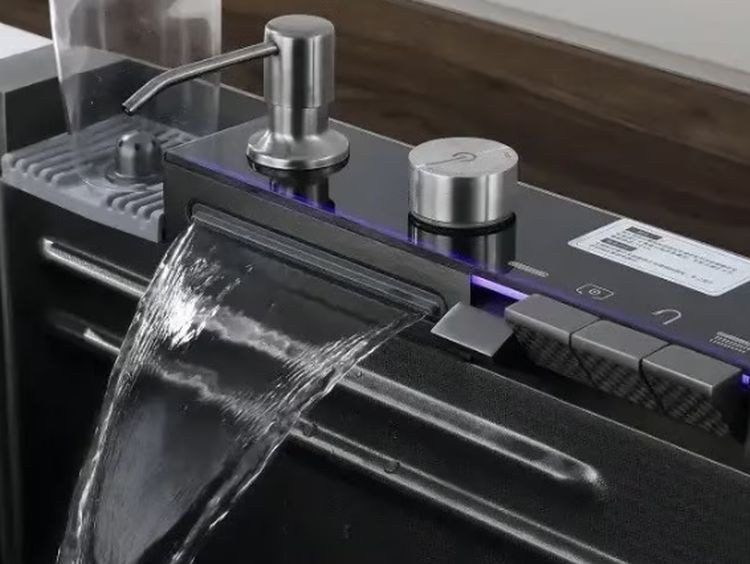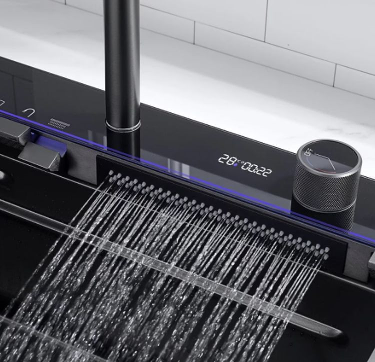Detroit elegáns rozsdamentes acél multifunkcionális konyhai mosogató dupla csappal, pohármosóval, LED kijelzővel, vágódeszkával - 75 cm x 45 cm