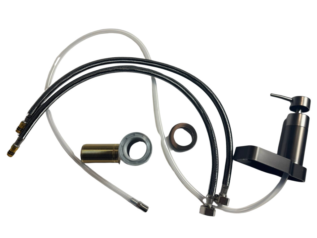 Modern, prémium minőségű konyhai csaptelep integrált szappanadagolóval, elegáns matt fém felülettel. Ergonomikus kialakítása, mozgatható feje és a csaphoz illeszkedő adagoló praktikus és esztétikus megoldást kínál minden modern konyhához.