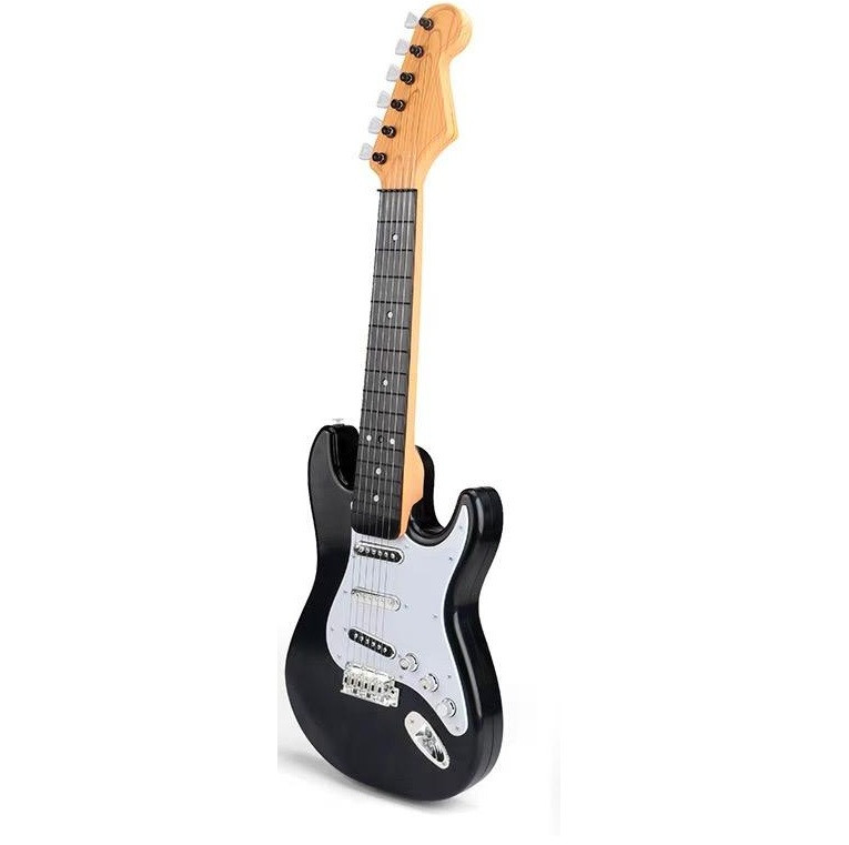 Stílusos, fekete elektromos gitár gyerekeknek. Könnyen kezelhető potméterekkel és kényelmes fogású nyakkal. Ideális játék hangszer gyerekeknek.