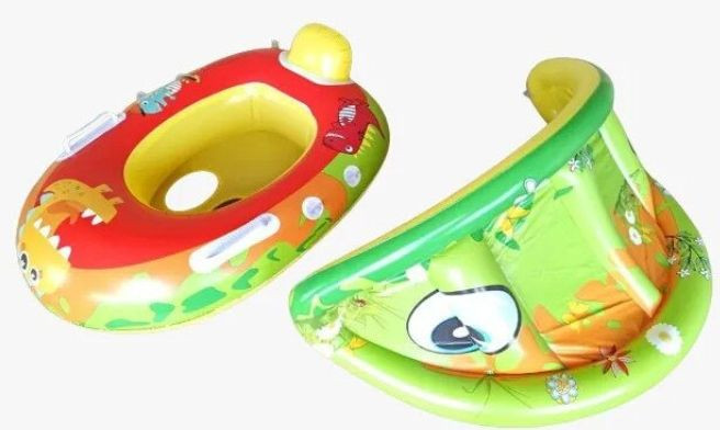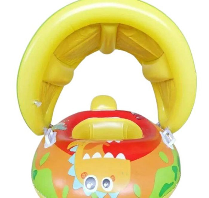 Vidám mintájú, felfújható gyerek úszógumi beépített napellenzővel. Biztonságos és kényelmes megoldás a kicsik számára a vízben, miközben a napellenző védi őket az erős napsütéstől.