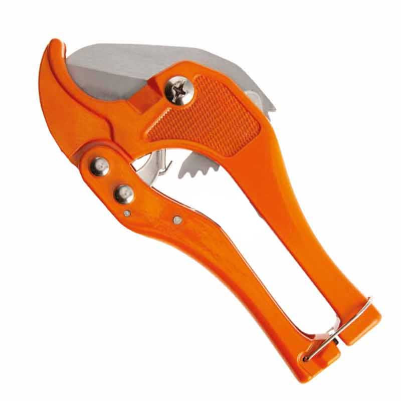 Erős, racsnis mechanikával ellátott PVC csővágó olló, amely gyors és sorjamentes vágást biztosít műanyag csövekhez. Ideális víz-, fűtés- és öntözőrendszerek szereléséhez.